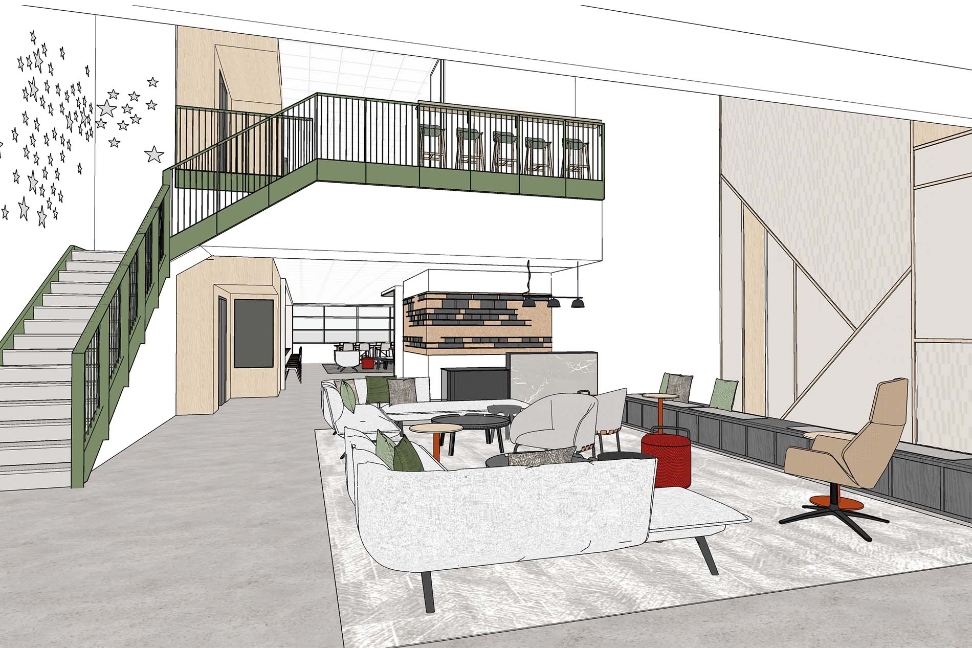 The design inspiration is centered on the theme of honor. Intricate details like uniform colors and accents are woven throughout the space. Including the feature, wall made up of military service ribbons. Soldier portraits, an oversized American flag, and a star-studded donor wall are just a few of the unique elements that make up the space. The materials and finishes are a mix of industrial and soft textures to convey a military-style that’s approachable and feels comforting.