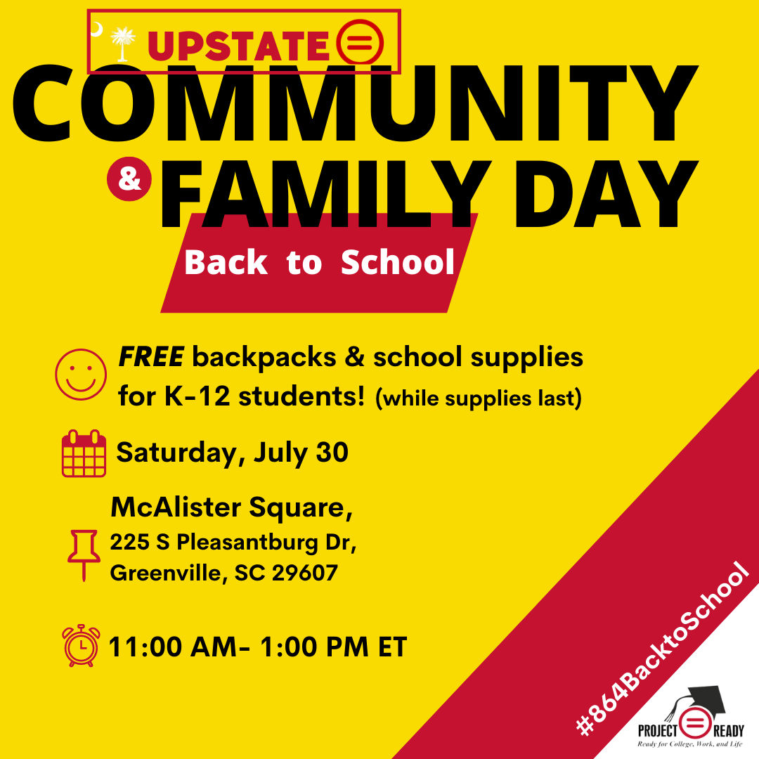 Greenville, SC – The Urban League of the Upstate, a local non-profit organization, and its college access program, Project Ready along with over twenty organizations have united to present one major back-to-school event called the Upstate Community and Family Day. There will be free backpacks, school supplies, and more on July 30th, 2022, at 225 S. Pleasantburg Drive, Greenville, SC 29607(McAlister Square) from 11:00 AM-1:00 PM. For additional information, contact Rev. Matthew Long, Jr. at 864.501.4222 or mlongjr@urbanleagueupstate.org.