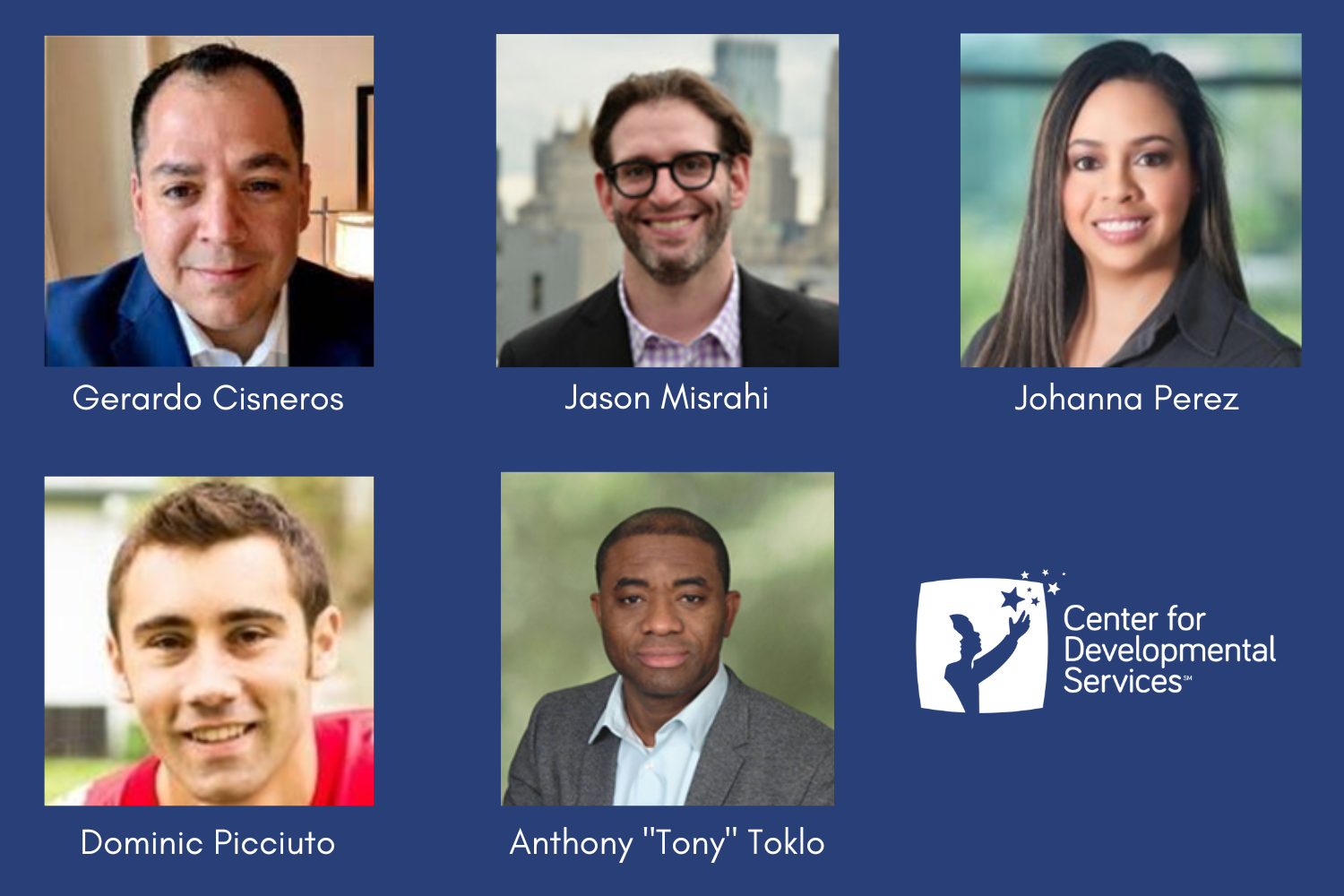 The Center for Developmental Services announces the appointment of five new members to its Board of Directors: Gerardo Cisneros, Jason Misrahi, Johanna Perez, Dominic Picciuto, and Anthony “Tony” Toklo.