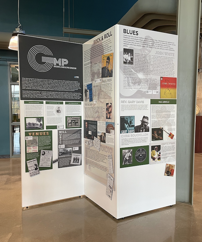 Greenville Music Preservation is proud to announce the debut of our new mobile exhibit, currently located at the Greenville County Fine Arts Center. This six-panel exhibit covers the development of music in Greenville County over the course of the 19th and 20th centuries. Major artists, venues, and organizations are explored by looking at the development of each major genre of music. QR codes are used