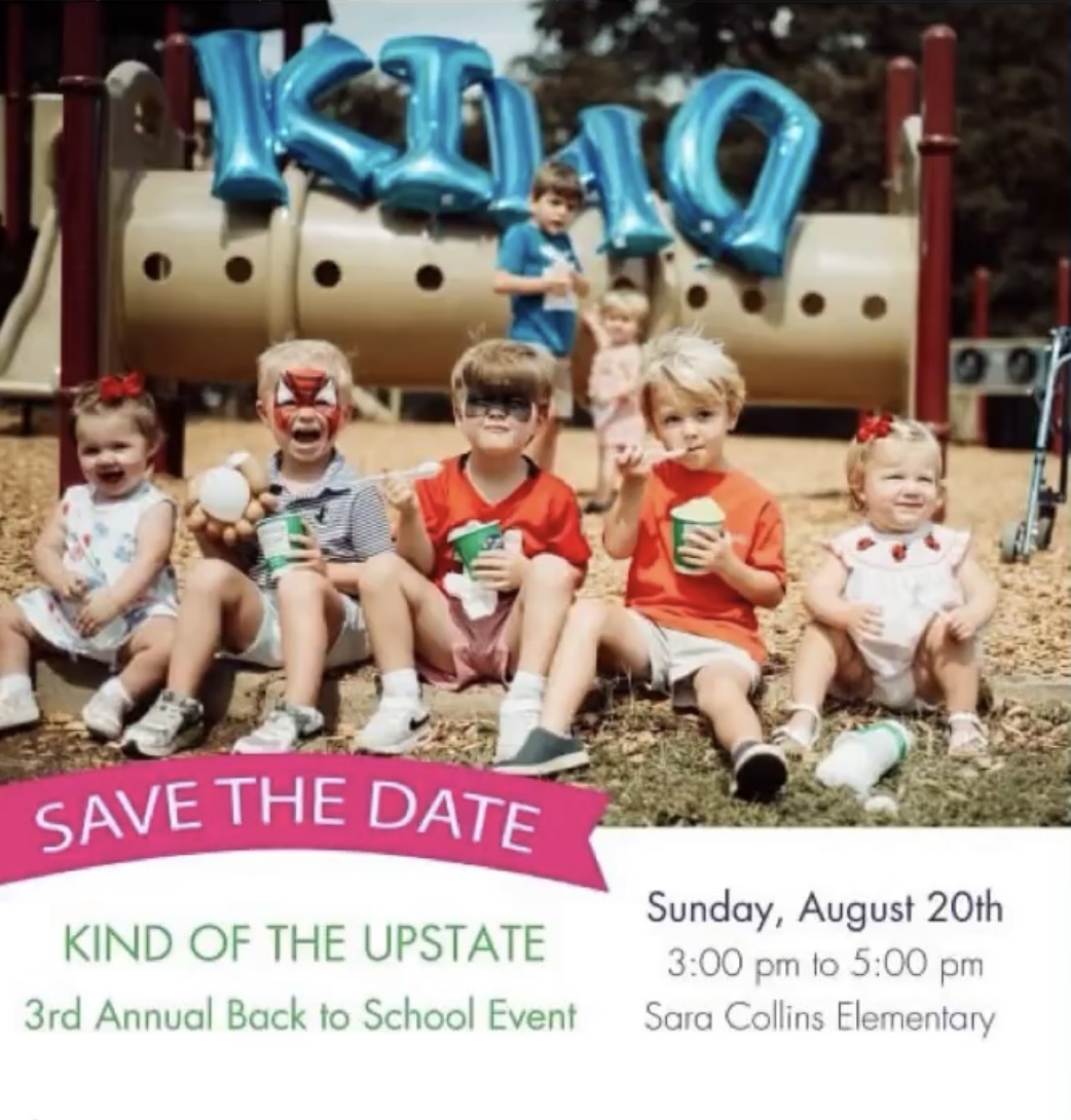 KIND of the Upstate’s Third Annual Back to School Event will be held on Sunday, August 20 from 3 p.m. to 5 p.m. at Sara Collins Elementary School, 1200 Parkins Mill Road, Greenville. The event will take place on the school’s all-inclusive playground. The event will include jewelry designing with a s special appearance by Lucy Graham from The Upside Down Collection. Lucy creates jewelry to connect with others in hopes of sharing the upside to Down syndrome.