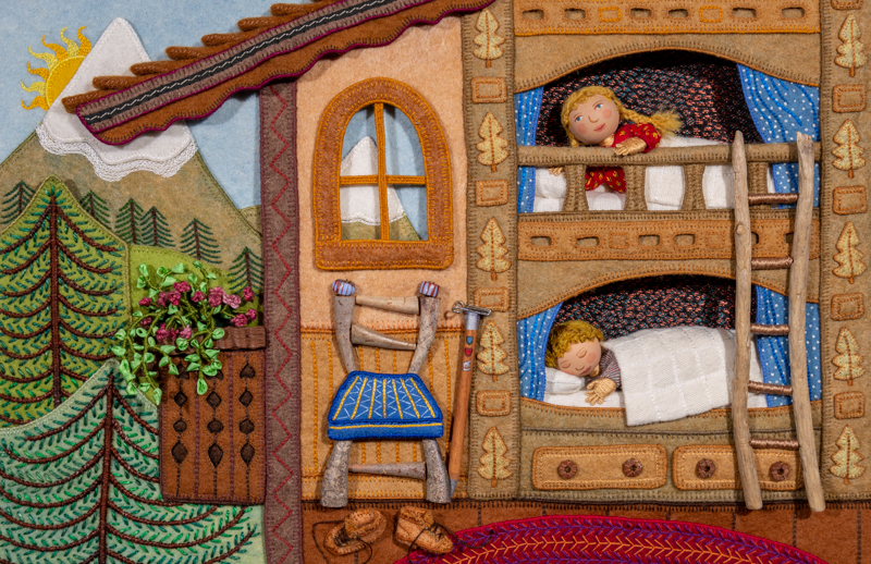 “Bedtime Stitches” is a product of Mavor’s four decades of developing her signature style while carving out her own niche within the children’s book world and the fiber art community. With a needle as her tool, thread as her medium, and stitches as her mark, she has created imaginative and intricate interpretations of everyday experiences for a multi-generational audience.