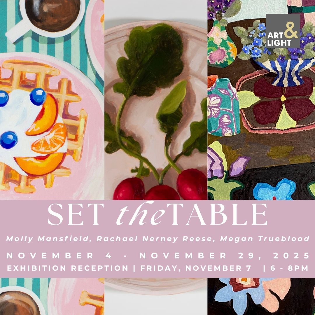 [GREENVILLE, S.C.] – Art & Light Gallery is happy to present “Set The Table”, an exhibition of work by Molly Mansfield (Austin, T.X.), Rachael Nerney Reese (Charleston, S.C.) and Megan Trueblood (Orem, U.T.) launching on the Art & Light website and in the gallery at 10:00 AM (EST) on Tuesday, November 4 with an opening reception on Friday, November 7 from 6:00 – 8:00 PM.