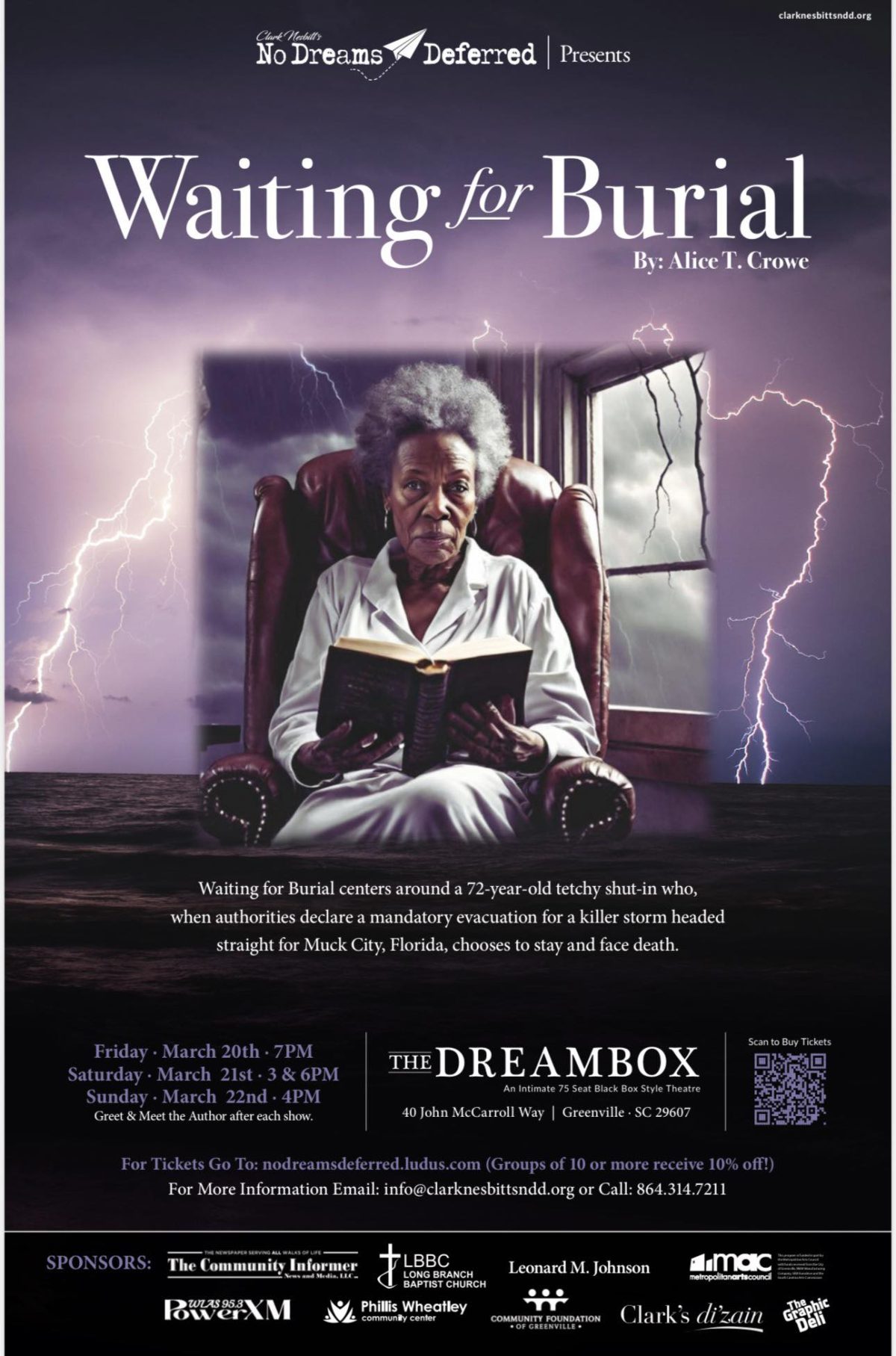 GREENVILLE, SC – FEBRUARY 20, 2026 – No Dreams Deferred Productions announces the premiere production of the groundbreaking sci-fi Afro-futurism play, “Waiting for Burial” at The Dreambox Theatre, 40 St. John McCarroll Way, Greenville, South Carolina, March 20-22, 2026. Tickets: Groups of 10 or more receive 10% off. Nodreamsdeferred.ludus.com. For more information about “Waiting for Burial” or to schedule interviews with Alice T. Crowe, please contact: