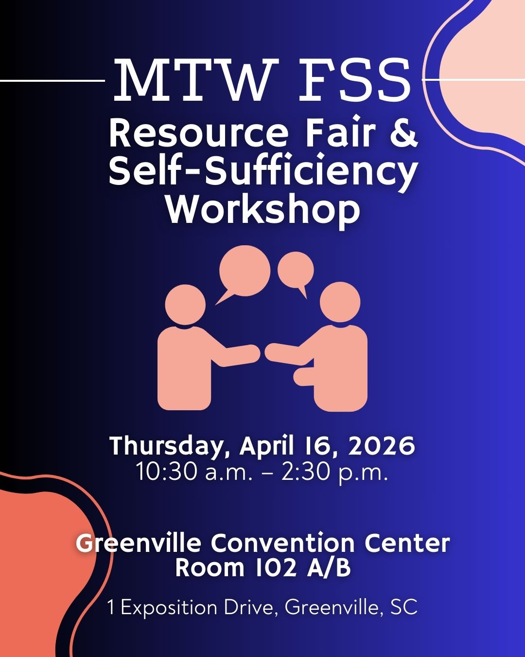 The MTW FSS Resource Fair & Self-Sufficiency Workshop will be held Thursday, April 16, 2026 from 10:30 a.m. to 2:30 p.m. at the Greenville Convention Center ( Room 102 A/B), 1 Exposition Drive, Greenville. Park near the Eisenhower Drive entrance.